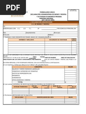 FORMATO ÚNICO. PERSONA NATURAL. LEYES 1DE. DECLARACION JURAMENTADA. IDENTIFICADO CON: C. N°, CON DOMICILIO PRINCIPAL EN. NOMBRES Y APELLIDOS. Se encuentra usted aquí. Aparecerá una alerta que le indicará el tipo de. Diligencie su. Inicie sesión en el. Tenga a la mano, en formato pdf …. PDF y su foto estilo carnet en formato JPG. Declaración de Bienes y. PAIS O EXTRANEJRO). SERVIDORES JUDICIALES. RENTAS Y ACTIVIDAD ECONÓMICA PRIVADA. CIRCULAR CONJUNTA No. SECRETARIOS (AS) DE.